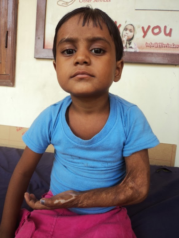 6 year old Yashoda is the daughter of Bhagwati(father) and Raghuwati(Mother). Bhagwati is mentally challenged and is unable to do anything. Raghuwati is a labourer and she is taking care of the whole family. 3 years ago little Yashoda got brunt, hot milk spilled on her hand. Her skin is badly injured and joined near elbow and she is not able to straighten her hand. The doctor has suggested an operation and plastic surgery. - at the Ramkrishna Mission Sevashram Hospital, Vrindavan. He gave an estimate of Rs 8000 which would include operation, post operative care, medicine etc.